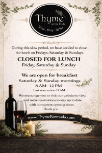 Thyme, located in the heart of Fritholme Gardens at “The Club,” combines great food, exceptional service, and an inviting atmosphere for a dining experience that feels distinctly Bermudian. Surrounded by beautiful architecture and scenic views, we craft fresh, seasonal dishes with locally grown herbs and vegetables, capturing the flavors of the island in every bite. Our daily specials surprise and delight, while our exclusive selection of Simons’ Rum Swizzles—crafted with tropical flavors like Watermelon, Mango, and Coconut—offers a unique twist on Bermuda’s classic cocktail.